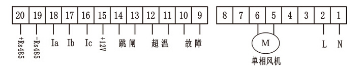 注:產(chǎn)品帶有485通訊輸出(端子19,20)標(biāo)準(zhǔn)的MODBUS,同時帶有3路4~20mA模擬量輸出(Ia、Ib、Ic,端子18,17,16)這2項功能為可選功能,單相風(fēng)機(jī)的接線圖如上圖所示。