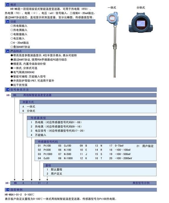 HR-WB是一款現(xiàn)場(chǎng)安裝式智能溫度變送器,可用于熱電阻(RTD)、熱電偶(TC)、電阻(Ω)、電壓(mV)信號(hào)輸入,二線制4~20mA輸出,通過(guò)HART協(xié)議組態(tài),直觀顯示所測(cè)溫度值、百分比棒圖、傳感器類(lèi)型等。