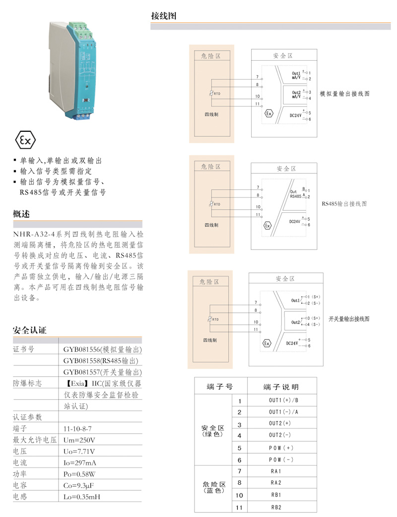 NHR-A32-4四線制熱電阻輸入檢測(cè)端隔離柵,將危險(xiǎn)區(qū)的熱電阻測(cè)量信號(hào)轉(zhuǎn)換成對(duì)應(yīng)的電壓、電流、RS485信號(hào)或開(kāi)關(guān)量信號(hào)隔離傳輸?shù)桨踩珔^(qū)。該產(chǎn)品需獨(dú)立供電,輸入/輸出/電源三隔離。本產(chǎn)品可用在四線制熱電阻信號(hào)輸出設(shè)備。
