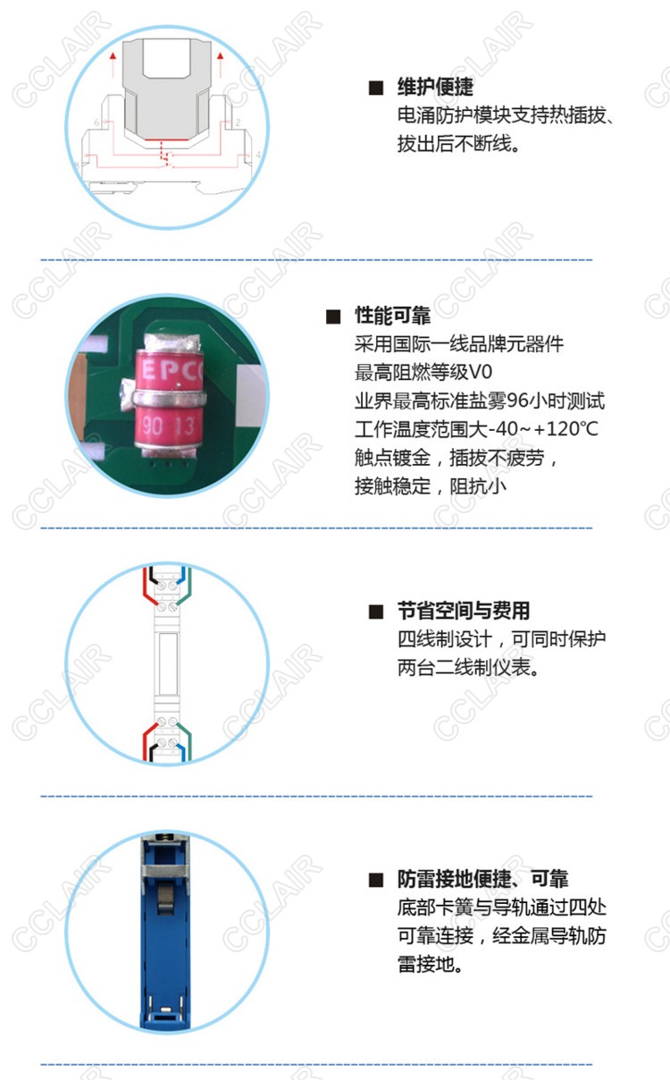 5V信號(hào)SPD,四線制,本安型,適用于線對(duì)地隔離電壓>500V信號(hào)回路,最大放電電流Imax(8/20us):20kA/線,12.5mm超薄,通過DIN35金屬導(dǎo)軌接地。