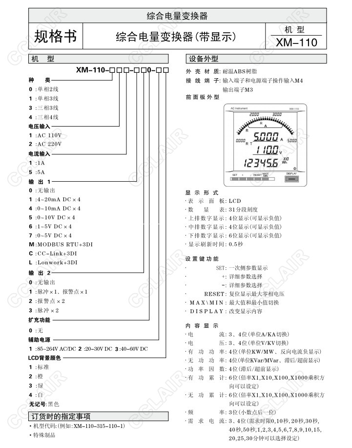 XM-110,XM-110-0 11,XM-110-1 11,XM-110-2 11,XM-110-3 11,XM-110-4 11,綜合電量變換器(帶顯示)