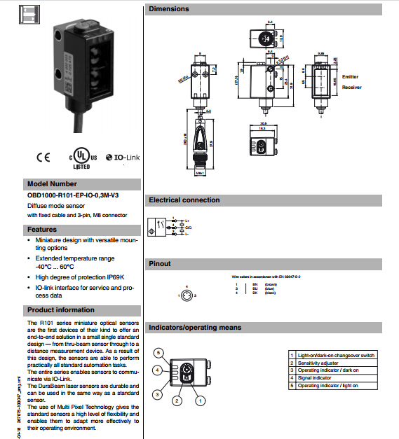 OBD1000-R101-EP-IO-0,3M-V3,漫反射型傳感器