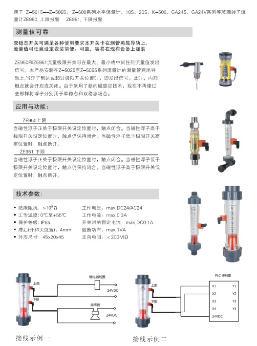 ZE950和ZE951流量極限開關(guān)可在最大、最小或中間任何流量值發(fā)出信號。本產(chǎn)品安裝在Z-5025至Z-5065系列流量計(jì)的測量管燕尾導(dǎo)軌 上,當(dāng)浮子到達(dá)或超過極限開關(guān)位置時(shí),即發(fā)出信號。此時(shí),內(nèi)部觸 點(diǎn)就會開啟或關(guān)閉。由于采用了新的磁感應(yīng)技術(shù),現(xiàn)在不再像過去 那樣將浮子分別用于單穩(wěn)態(tài)和雙穩(wěn)態(tài)場合。