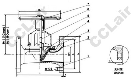 部件列表:1.閥體 2.閥體襯里 3.隔膜 4.閥瓣 5.閥桿 6.閥蓋 7、手輪