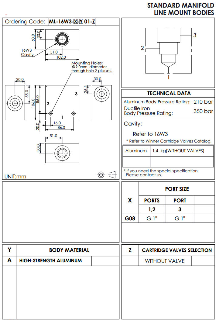 型號(hào): ML-16W3-G08-A01,winner標(biāo)準(zhǔn)配管式油路板