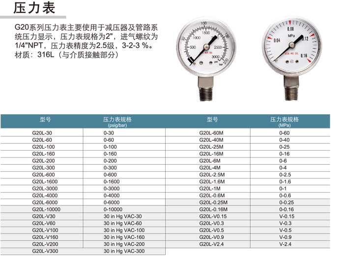G20L-30,G20L-60,G20L-100,G20L-160,G20L-200,G20L-300,G20L-600,G20L-1600,G20L-3000,壓力表