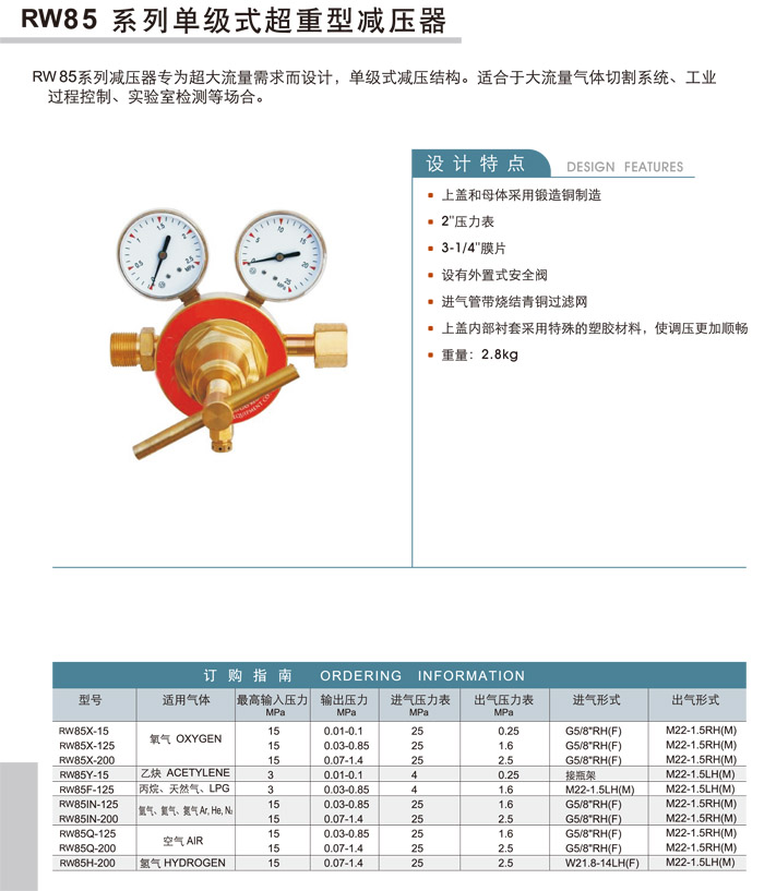 RW85X-15,RW85X-125,RW85X-200,RW85Y-15,RW85F-125,RW85IN-125,RW85Q-125,RW85Q-200,RW85H-200,單級式超重型減壓器