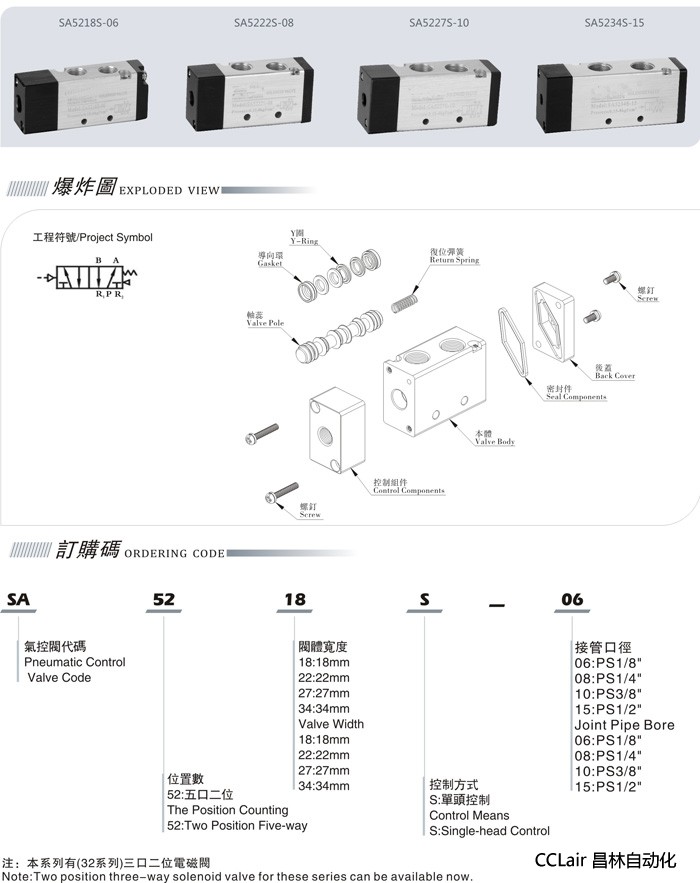 SA5222S-06,SA5218S-06,SA5227S-08,SA5234S-10,五口二位氣控閥
