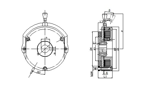 該系列電磁失電安全制動器主要由勵磁部分(磁軛1、線圈2、彈簧3、銜鐵4)、制動盤7、花鍵套8等主要零部件組成。勵磁部分通過安裝螺栓6安裝在機(jī)座上,旋轉(zhuǎn)安裝螺栓6調(diào)整氣隙至初始安裝氣隙推薦值δ后(見安裝尺寸參數(shù)表),反向旋出空心螺栓5,頂緊勵磁部分?;ㄦI套通過矩形花鍵與傳動軸相連;制動盤7與花鍵套8通過漸開線花鍵嚙合。當(dāng)線圈斷電時,在彈簧力的作用下,制動盤7與銜鐵4、機(jī)座9端面產(chǎn)生摩擦力,通過花鍵套8傳給傳動軸,使軸制動。當(dāng)線圈通電后,在電磁力作用下,銜鐵4被吸向磁軛1,使制動盤7松開,傳動軸制動解除。