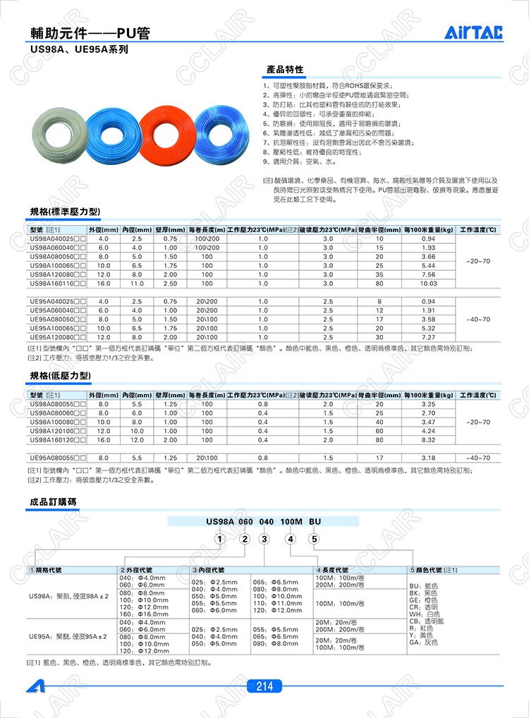 AIRTAC亞德客 壓力型PU管US98A04002520MBU,US98A040025100MBK,US98A040025100MGE,US98A040025100MCR,US98A040025100MWH US98A040025100MCB,US98A040025100MR,US98A040025100MY,US98A040025100MGA,US98A040025200MBU US98A040025200MBK,US98A040025200MGE,US98A040025200MCR