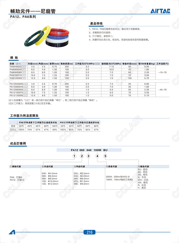 詳細(xì)信息 PA6040025100MBU,PA6040025100MBK,PA6040025100MGE,PA6040025100MN,AIRTAC尼龍管