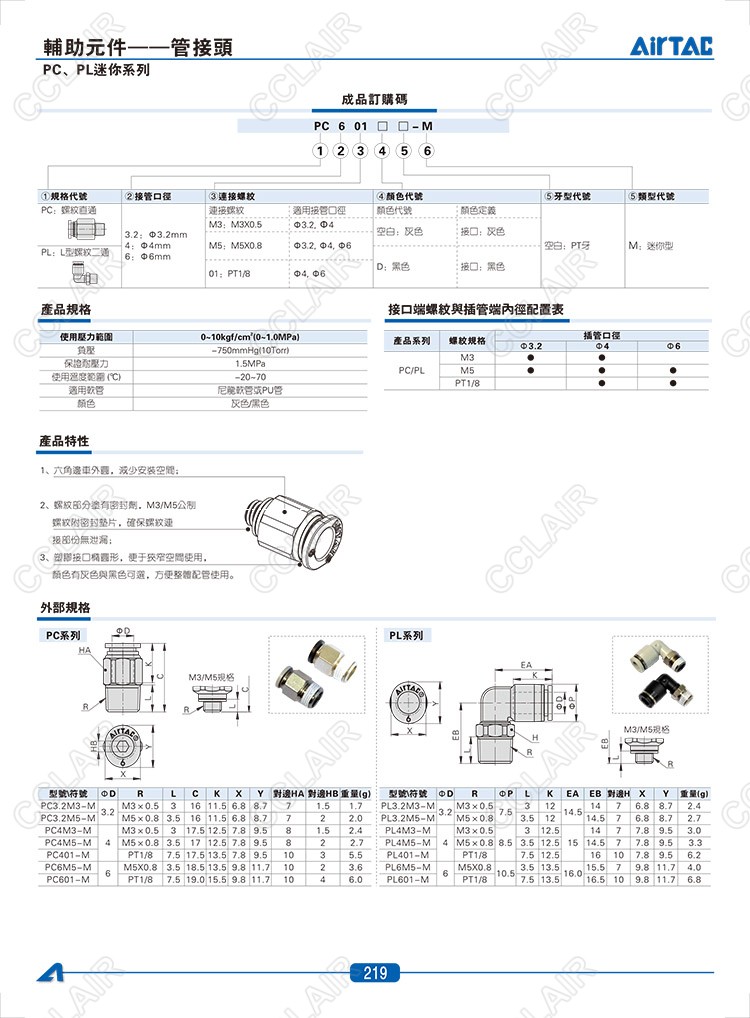 PC3.2M3-M,PC3.2M5-M,PC4M3-M,PC4M5-M,PC401-M,PC6M5-M,PC601-M,臺灣AIRTAC管接頭