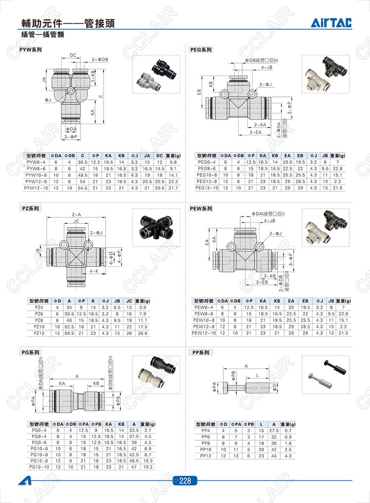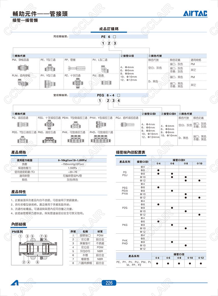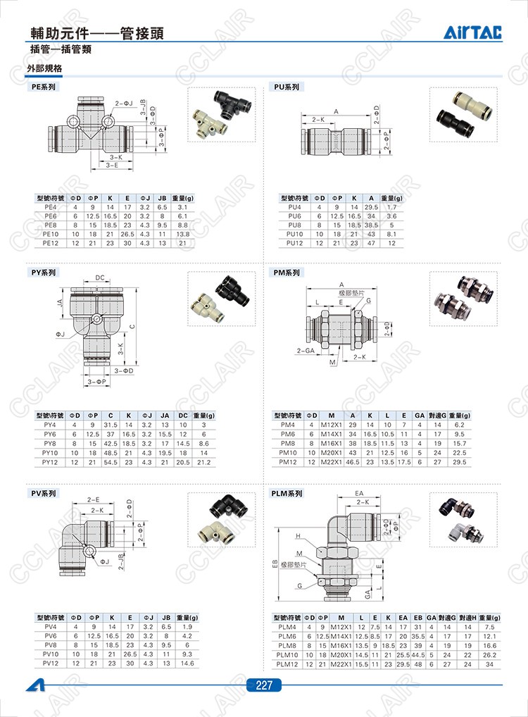 PE4,PU4,PY4,PM4,PV4,PLM4,PYW6-4,PEG6-4,PZ4,PEW6-4,PG6-4,PP4,PGJ6-4,PZG6-4,PKG6-4,AIRTAC管接頭