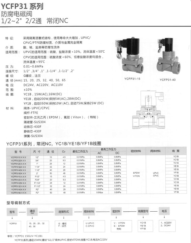 YCFP3115,YCFP3120,YCFP3125,YCFP3132,YCFP3140,YCFP3150,防腐電磁閥