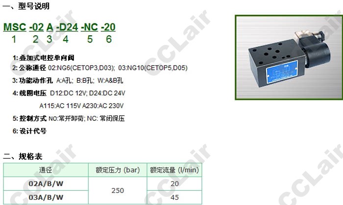 MSC-02A-D24-NC-20,MSC-03A-D12-NC-20,MSC-03W-D12-NO-20,MSC-02B-A230-NO-20,疊加式電控單向閥