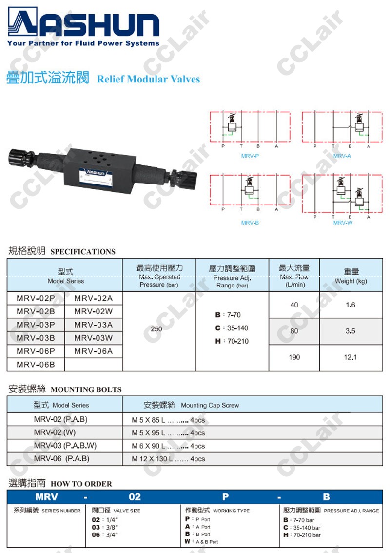 MRV-02P,MRV-02A,MRV-02B,MRV-02W,MRV-03P,MRV-03A,MRV-03B,MRV-03W,MRV-06P,MRV-06A,MRV-06B,ASHUN油順疊加式溢流閥