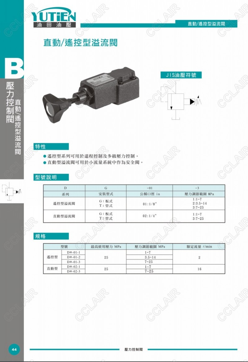 YUTIEN油田直動/遙控型溢流閥DG-01-1,DT-01-2,DG-02-1,DT-02-3