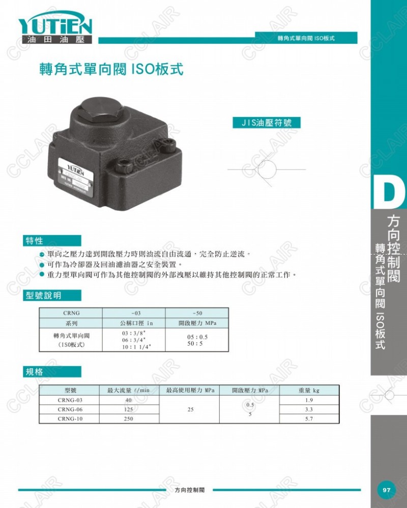 YUTIEN油田 轉(zhuǎn)角式單向閥CRNG-03-05,CRNG-03-50,CRNG-06-05,CRNG-06-50,CRNG-10-05,CRNG-10-50