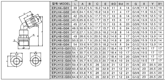 EPLH4-G01,EPLH6-G04,EPLH8-G01,EPLH10-G01,EPLH12-G02,EPLH8-G02,45°螺紋二通接頭