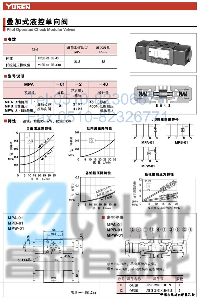 MPW-01-2-40,MPW-01-2-4001,MPW-01-4-40,疊加式液控單向閥,榆次油研疊加式液控單向閥,YUKEN疊加式液控單向閥