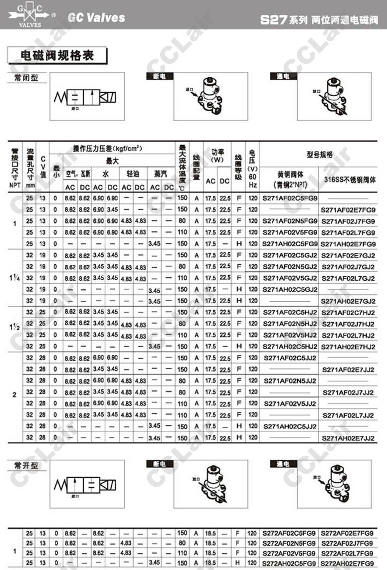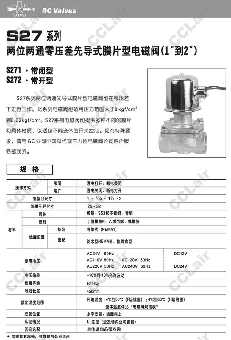 S271AF02,S272AF02,S271AH02,S272AH02,S272AH02E7JJ2,S271AH02E7GJ2,S271AF02C7FG9,GC Valves二位二通零壓差電磁閥