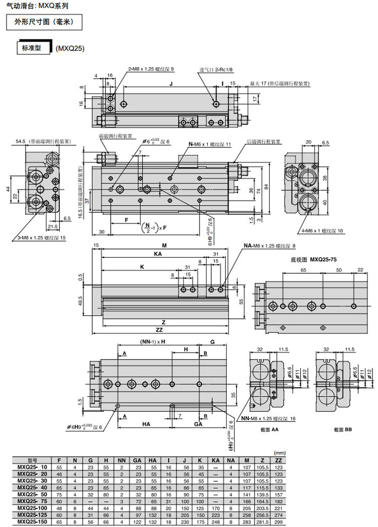 MXQ25-20,MXQ25-30,MXQ25-40,MXQ25-50,MXQ25-75,MXQ25-100,MXQ25-125,MXQ25-150,
