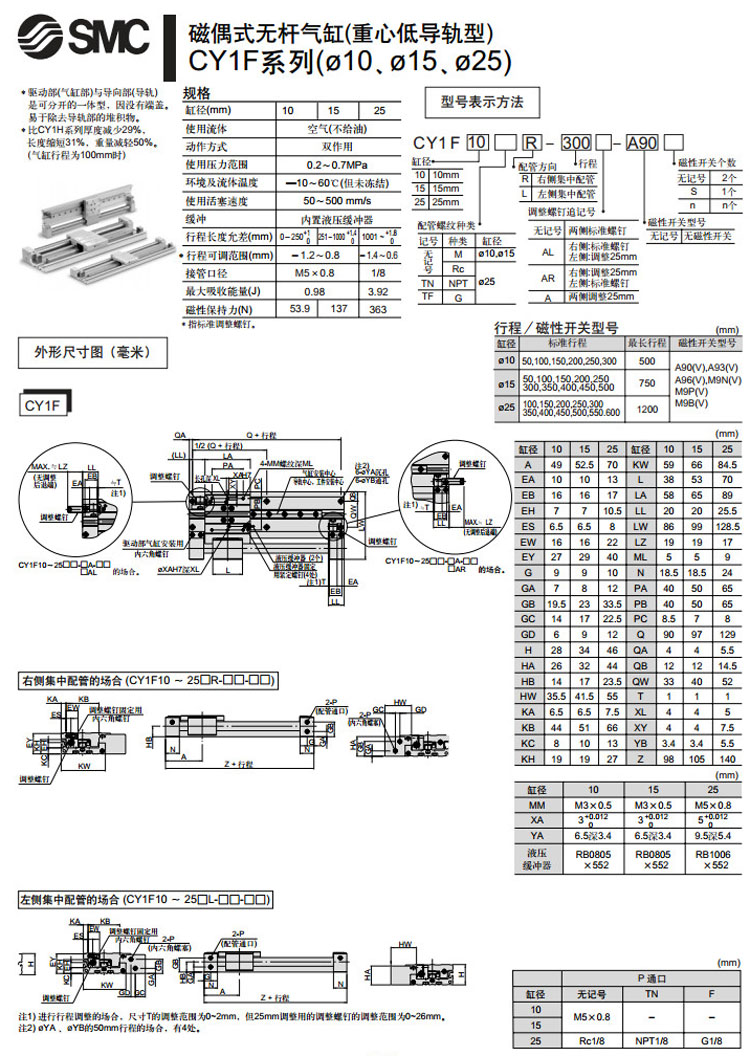 CY1F10R-50,CY1F15R-50,CY1F25R-50,CY1F10L-50,CY1F15L-50,CY1F25L-50,SMC磁偶式無桿氣缸