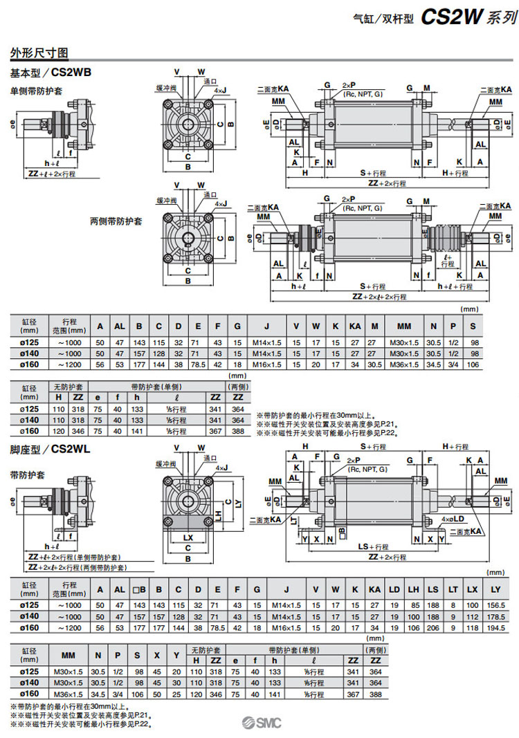 CS2WB125,CS2WL125,CS2WF125,CS2WT125,CDS2WB125,CDS2WL125,CDS2WF125,CDS2WT125,SMC雙桿型氣缸