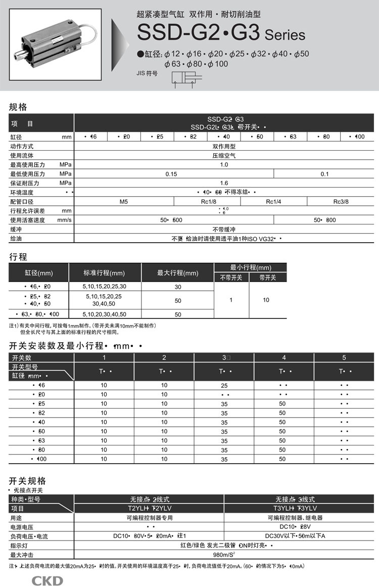 SSD-G2-16-5,SSD-G3-16-10,SSD-G2L-16-10,SSD-G3L-16-20,CKD超緊湊型氣缸
