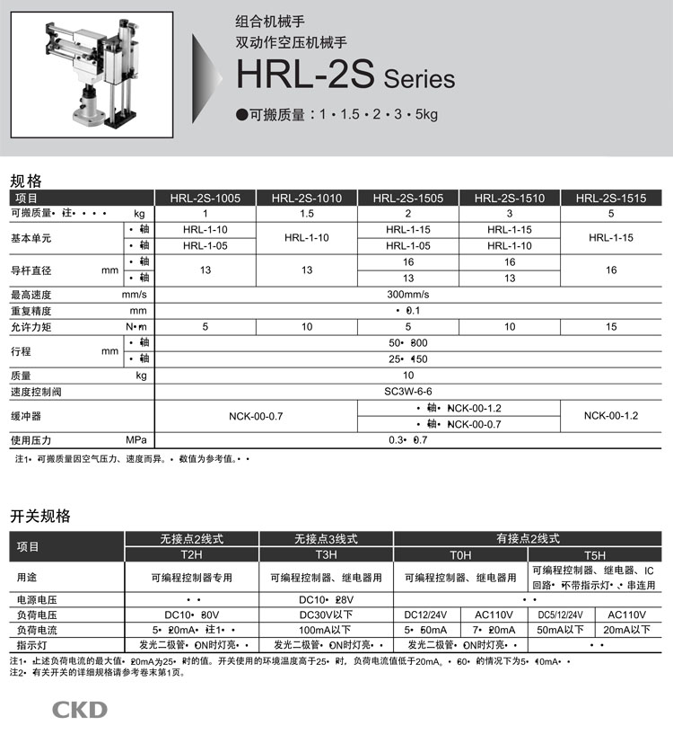 HRL-2S-1005,HRL-2S-1010,HRL-2S-1505,HRL-2S-1510,HRL-2S-1515,CKD雙動作空壓機械手