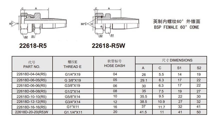 22618D-04-04(R5),22618D-06-05(R5),22618D-08-08(R5),22618D-10-10(R5),22618D-20-20(R5)W,扣壓式軟管接頭