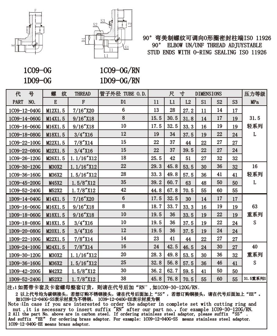 1C09-12-040G,1C09-14-060G,1C09-16-060G,1D09-36-160G,1D09-42-200G,1D09-52-240G,公制螺紋卡套接頭
