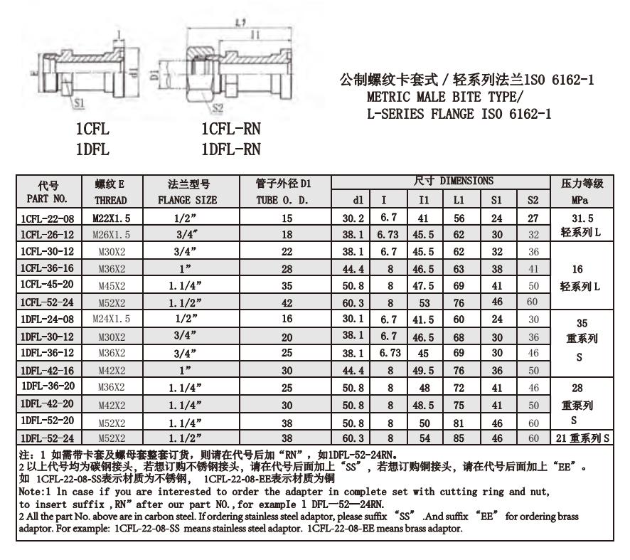1CFL-22-08,1CFL-26-12,1CFL-30-12,1CFL-36-16,1DFL-42-20,1DFL-52-20,1DFL-52-24,公制螺紋卡套接頭
