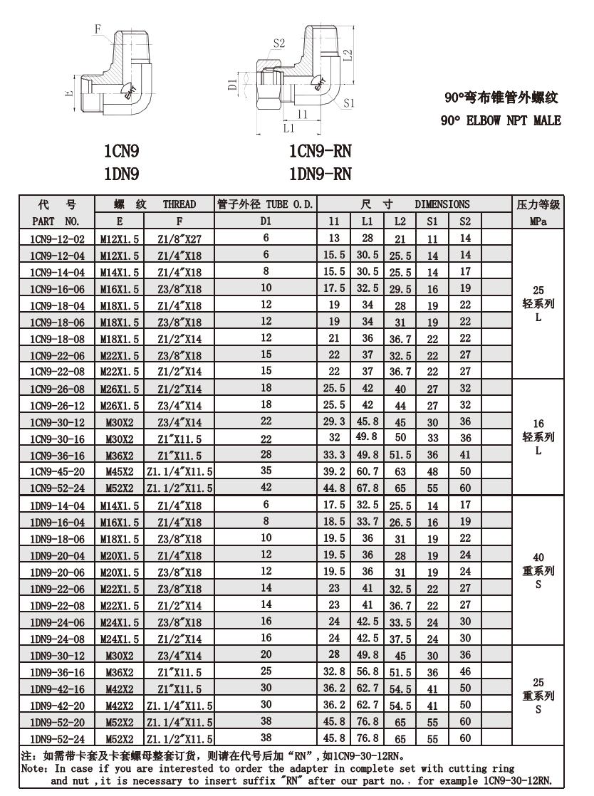 1CN9-12-04,1CN9-14-04,1CN9-22-06,1CN9-30-12,1DN9-36-16,1DN9-42-16,1DN9-52-20,公制螺紋卡套接頭