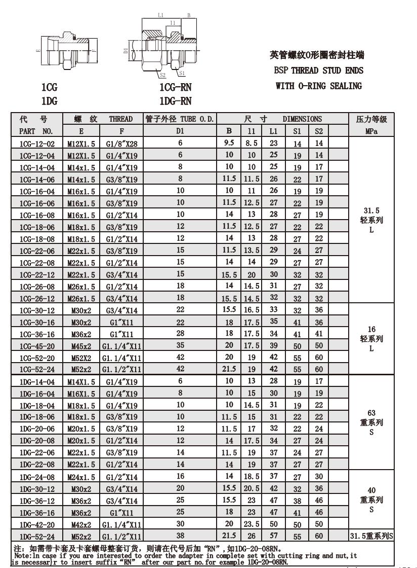 1CG-12-02,1CG-14-04,1CG-16-06,1CG-18-06,1DG-30-12,1DG-42-20,1DG-52-24,公制螺紋卡套接頭