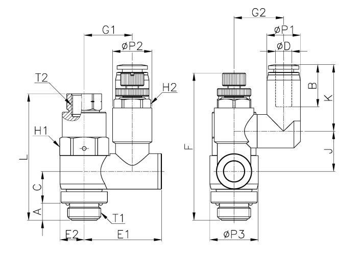 | Model | ∅D | A | T1 | T2 | B | ∅P1 | ∅P2 | ∅P3 | C | L | E1 | E2 | F/MIN | F/MAX | G1 | G2 | J | K | H1(Hex) | H2(Hex) | WEIGHT(g) | BOX(EA) |
