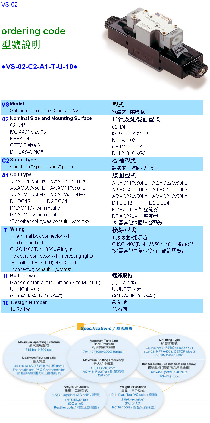 VS-02-C2-A1-T-U-10,VS-02-C2-A2-T-U-10,VS-02-C2-A3-T-U-10,VS-02-C2-A4-T-U-10,HYDROMAX電磁方向控制閥 |