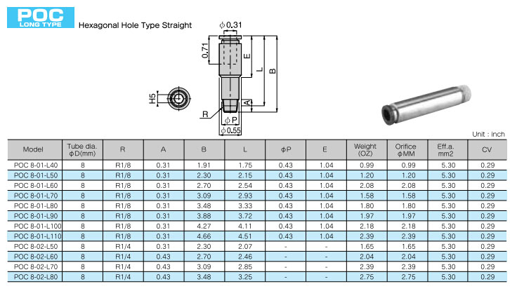 POC8-01-L40,POC8-01-L50,POC8-01-L60,POC8-02-L50,POC8-02-L60,POC8-01-L70,POC8-01-L80,PISCO加長管接頭