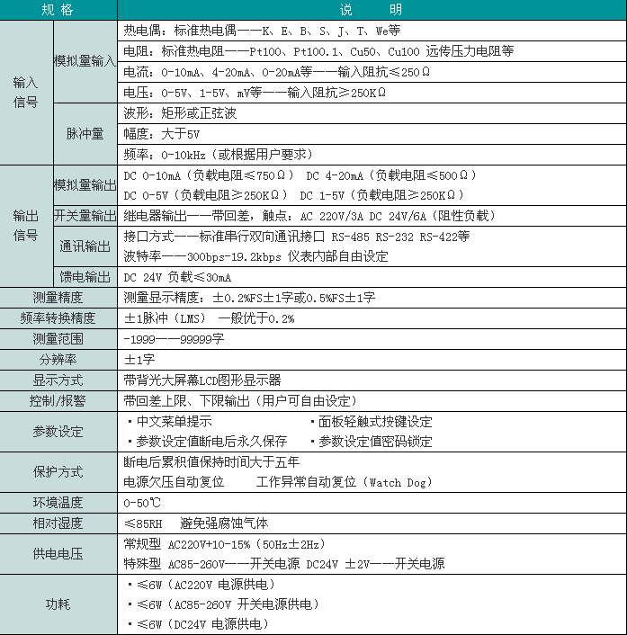 本表所列為最大量程,用戶可在量程范圍內(nèi)通過修改儀表二級(jí)參數(shù)確定量程范圍