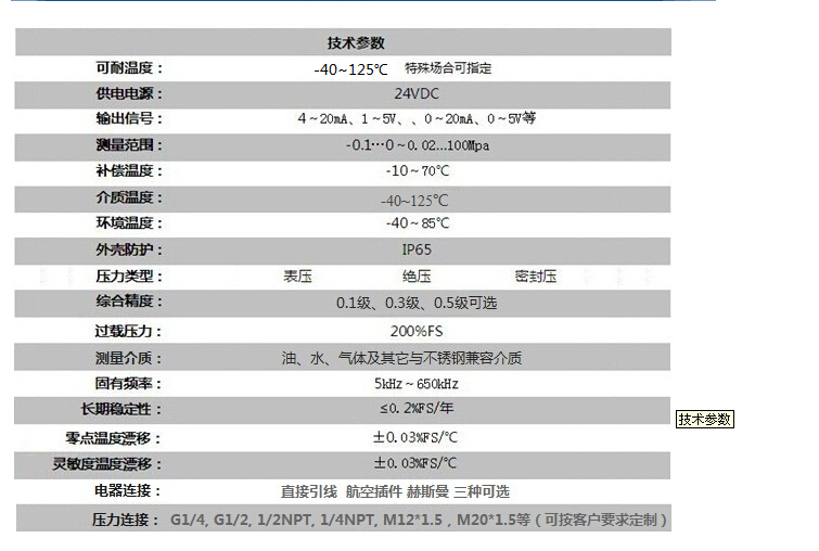 產(chǎn)品特點(diǎn): 316L不銹鋼隔離膜片結(jié)構(gòu) 高精度、全不銹鋼結(jié)構(gòu) 微型放大器,電壓、電流、頻率信號(hào)輸出 抗干擾強(qiáng)、長(zhǎng)期穩(wěn)定性好 外形結(jié)構(gòu)多樣化 質(zhì)保期: 12個(gè)月