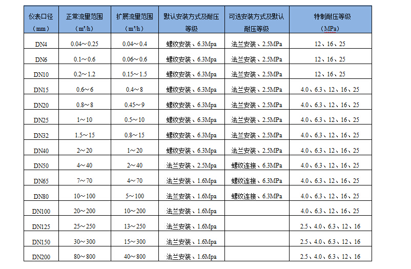 儀表口徑:4、6、10、15、20、25、32、40、50、65、80采用螺紋連接