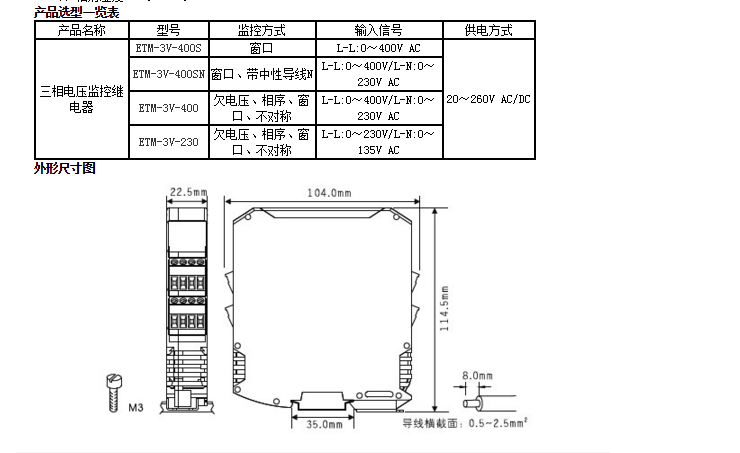 ETM-3V-230、ETM-3V-400、ETM-3V-400、ETM-3V-400三相電壓監(jiān)控,依據(jù)用戶設(shè)定值實現(xiàn)對三相電的欠壓、過壓、不平衡度以及相序故障監(jiān)控。該模塊具有雙刀雙擲繼電器輸出。產(chǎn)品采用20~260V a.c./d.c.供電。電源、輸入和輸出三隔離。