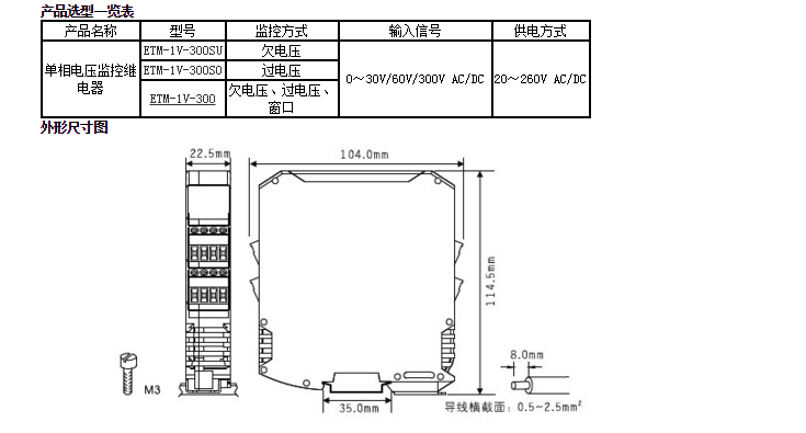 ETM-1V-300、ETM-1V-300SO、ETM-1V-300SU單相電壓監(jiān)控,依據(jù)用戶設(shè)定值實(shí)現(xiàn)對(duì)單相電的欠壓、過(guò)壓故障的監(jiān)控。該模塊具有雙刀雙擲繼電器輸出。產(chǎn)品采用20~260V a.c./d.c.供電。電源、輸入和輸出三隔離。