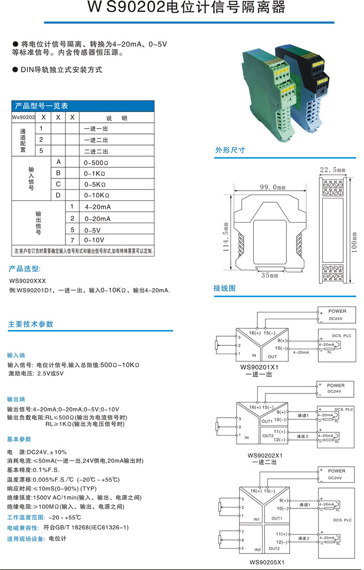 WS9020電位計(jì)變送器 電位計(jì)信號(hào)調(diào)理模塊技術(shù)參數(shù)詳細(xì)介紹: