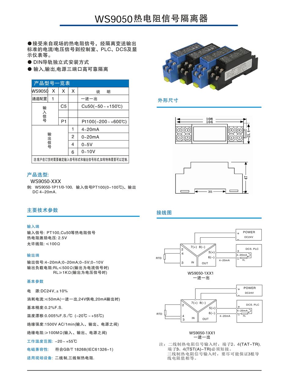 WS9050熱電阻信號溫度變送器,接受來自現(xiàn)場的熱電阻信號,經(jīng)隔離變送輸出標準的電流/電壓信號到控制室、PLC、DCS及顯示儀表等,輸入、輸出、電源三端口隔離,DINT型導(dǎo)軌安裝