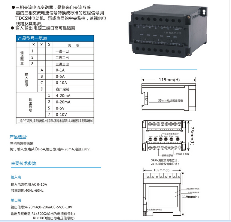 JA9774U-A3三相電壓變送器,是將來自交流互感器的三相交流電流信號轉(zhuǎn)換成標準的過程信號,用于DCS對電動機、泵或熱網(wǎng)的中央監(jiān)控,監(jiān)視工供電線路及其電流, 輸入、輸出、電源三端口隔離。