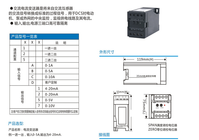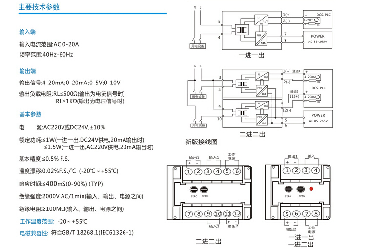 二相電流變送器電流變送器輔助電源:AC/DC220V 精度0.2級