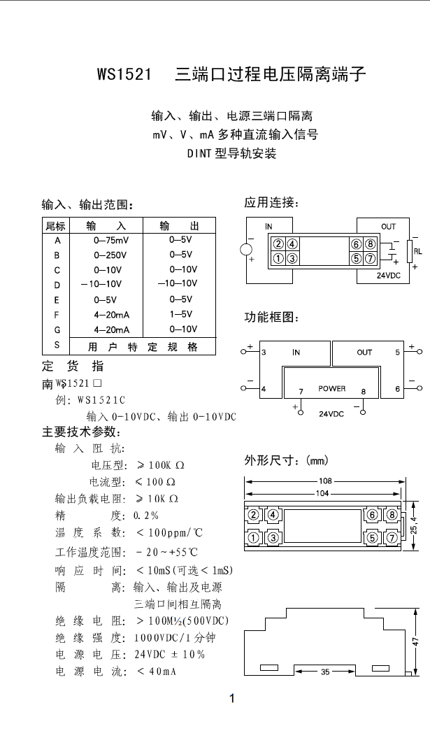 WS1521三端口直流電壓隔離變送器,隔離端子。輸入、輸出、電源三端口隔離,高低電壓、高低信號多種直流信號輸入,DIN T型導軌安裝