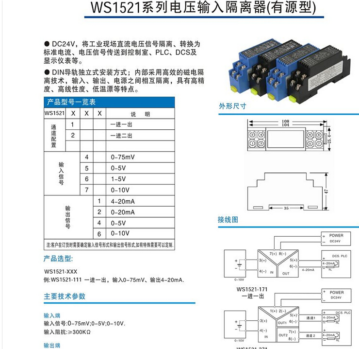 WS1521信號隔離器。三端口直流電壓隔離變送器,隔離端子。輸入、輸出、電源三端口隔離,高低電壓、高低信號多種直流信號輸入,DIN T型導(dǎo)軌安裝