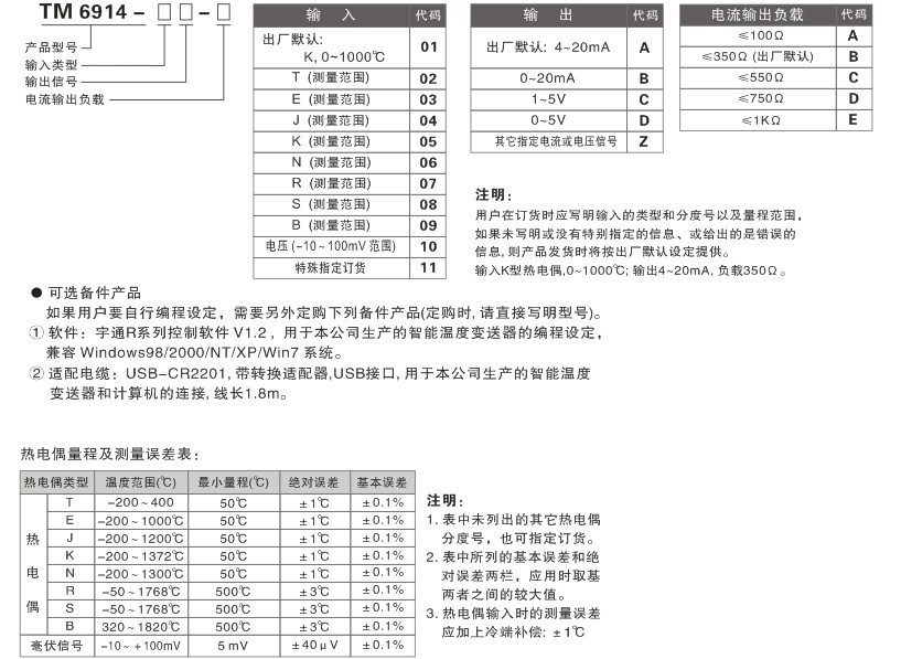 是智能型的溫度變送器, 有 USB 編程接口, 可以使用專用的編程電纜連接這個溫度變送器和PC機, 通過軟件在PC機上進行編程, 可以任意編程設定熱電偶分度號和測量溫度的量程范圍。